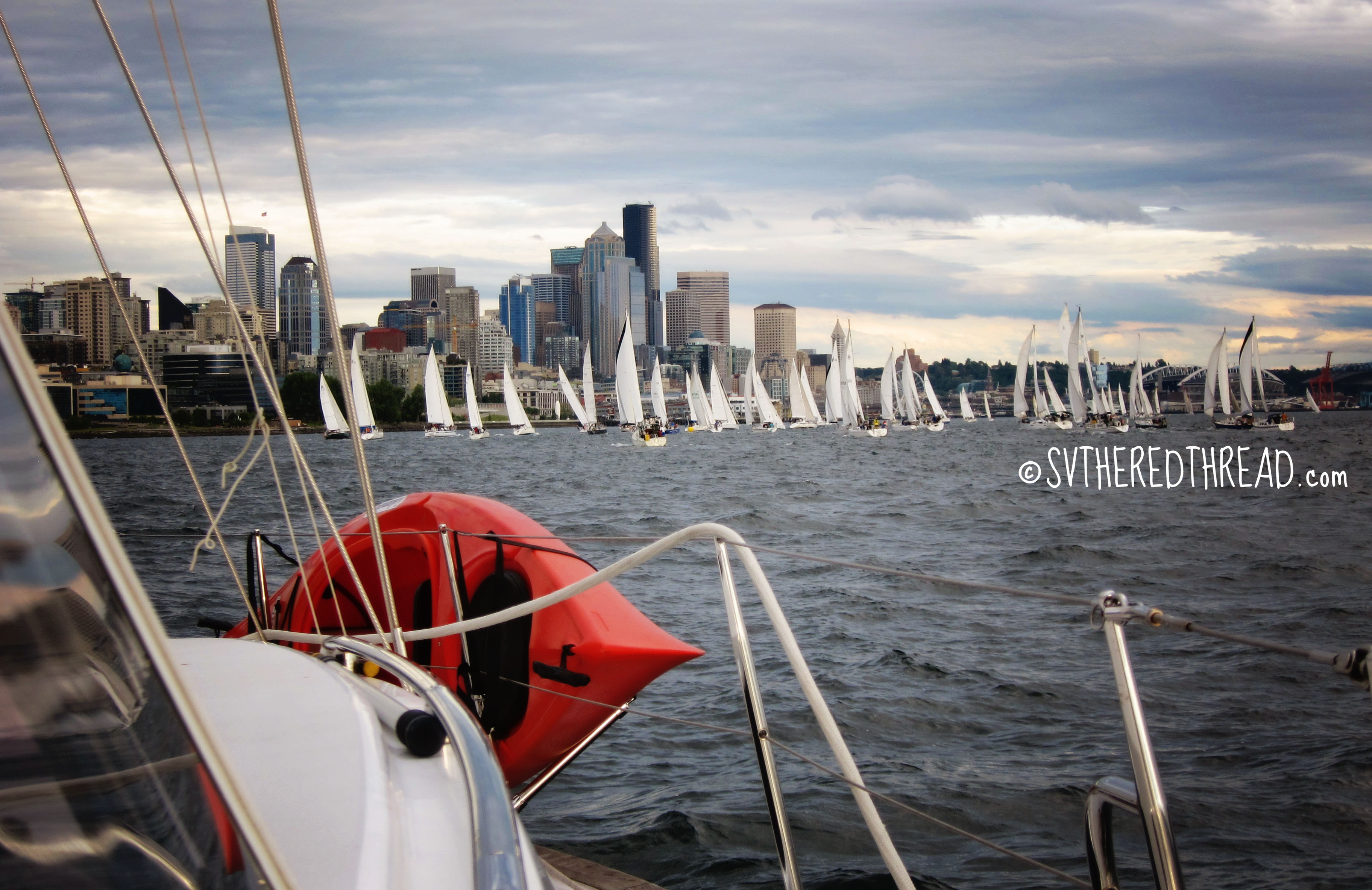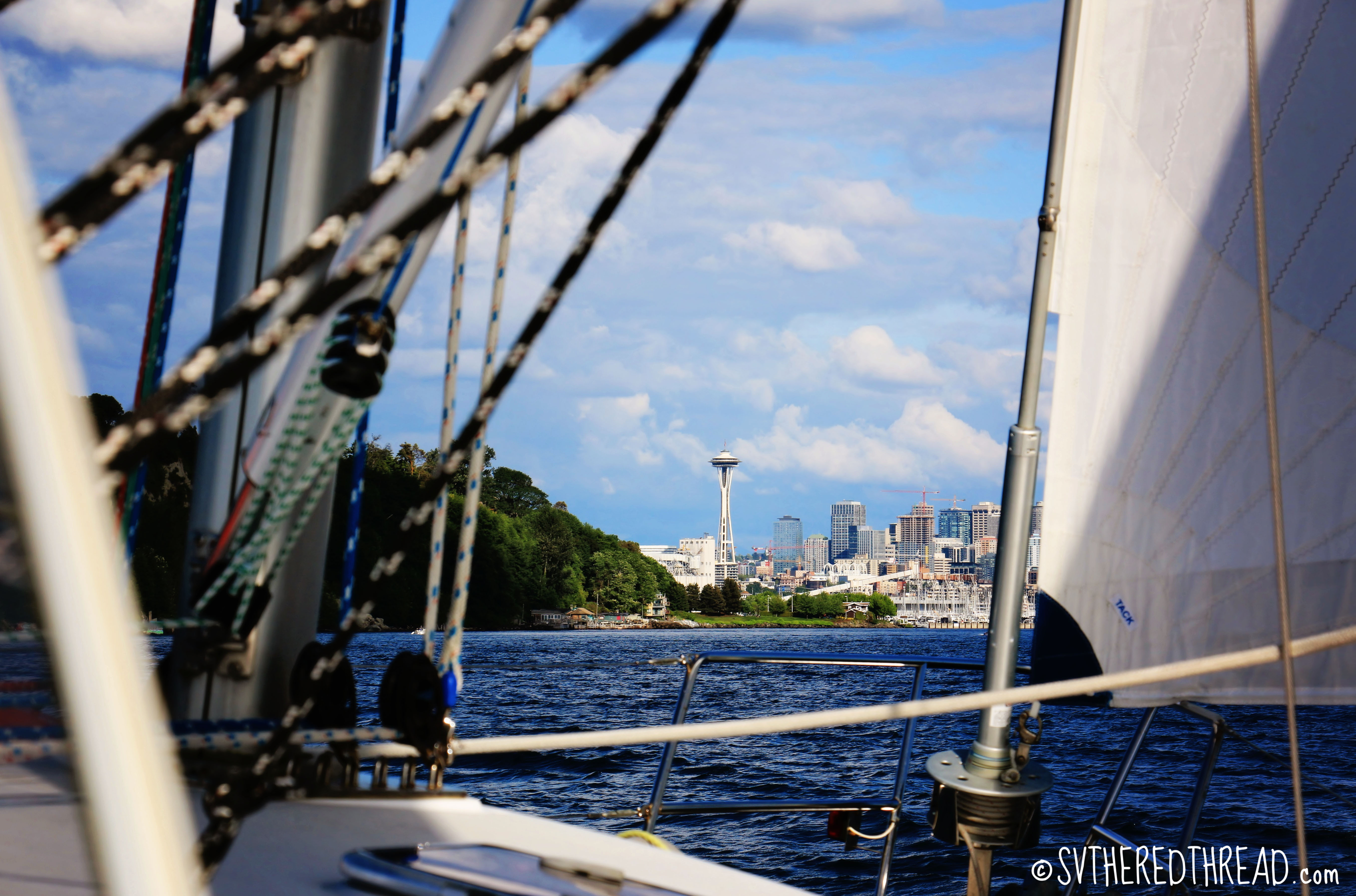After installing both sails, the only thing left to do was take The Red Thread out with her pretty new wings and see how she flew. Memorial Day weekend offered the perfect opportunity, and Jessie and I took her north about 35 miles to the beautiful little bay of Port Ludlow. The weekend was tremendous, as we got to catch up with some other cruisers who are also leaving the greater Seattle area this summer. On the way home, Jessie and I happened to catch a wonderful northerly wind and a following tide all the way back to Seattle. It was 30 nautical miles of sailing downwind through Admiralty Inlet. It was easily one of the loveliest sails we have ever had. We crisscrossed the Inlet, jibing when necessary, both of our beautiful new sails flying crisply in an 11- to 16-knot breeze.