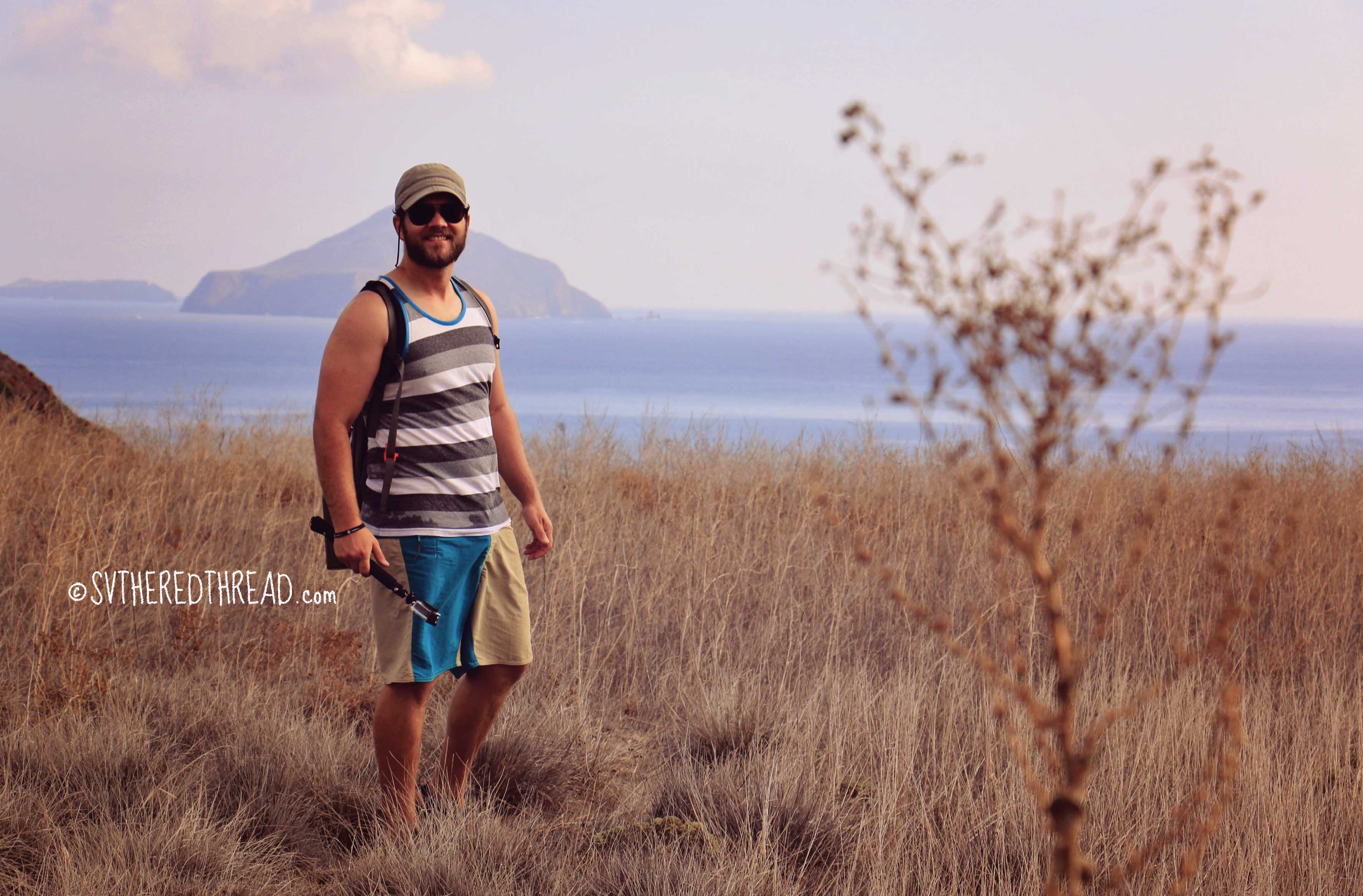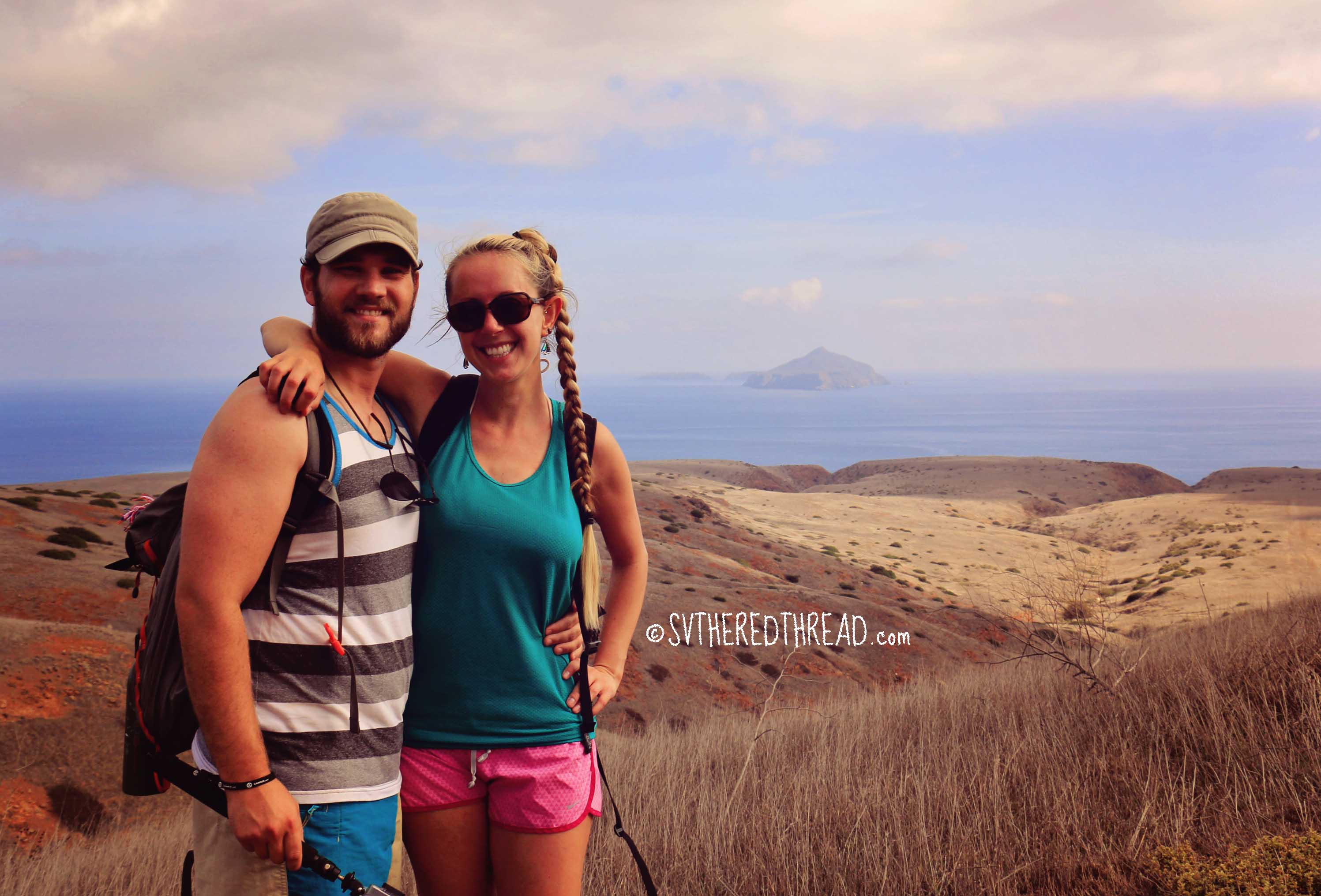 As the afternoon waned, winds shifted in our favor, and we hoisted our sails and saw three whale spouts far off in the distance. Winds rushed around the easternmost tip of the island, climbing to 22 knots, before subsiding to the low teens as we tucked into the lee of Santa Cruz Island. Our anchor dug deeply into the sandy bottom on our first attempt, and we watched the last flecks of light leave the sky. There was but one other boat in the anchorage. Peace. A gentle breeze dancing on top of the water, and the rhythmic sound of waves crashing on the shore was our serenade.#Santa Cruz Island_Smugglers Cove anchorageThus far, our South Pacific Stitch has taken us in and out of the busy harbors of San Francisco, Monterey, and Santa Barbara. By dawn, we were the only boat remaining in the anchorage. Today, for the first time ever, we stared down thru clear, turquoise water and saw the outline of our anchor chain laying heavy on the sand bottom. Although we had anchored well over 50 times prior to leaving on our journey, all of our prior anchorages were either in water too deep or too dark to be able to examine the set of our anchor. Here, in a desert island off the California coast, that changed.#Santa Cruz IslandWe brewed our coffee early, eager to set out exploring Santa Cruz, the largest of the Channel Islands. Neil launched one of our kayaks, and I climbed aboard our standup paddleboard. We rode the surf into shore, effectively drenching the gear we’d stored in the aft compartment of the kayak. Learning to beach our toys in surf will require some more practice! We hiked northwest from Smugglers Cove and summited the ridge that divides the island’s northern and southern halves. From the apex, we could see mainland California to the north and Anacapa Island to the east. There were a few other hikers who had taken a ferry from the mainland, mostly tourists wearing fancy day shoes and carrying pretty umbrellas. The exception was three guys who’d traveled for a womanless weekend of camping. We spent a while chatting with them as they cast their lines from the beach, fishing successfully for surfperch. Our stop on Santa Cruz Island was among the first moments of our travels thus far in which we felt completely relaxed and at ease. We were surrounded with natural beauty and had nothing to do but take it all in.#Santa Cruz Island_Neil#Santa Cruz Island_TRT from the cliffs#Santa Cruz Island_Hike from Smugglers CovePassage perks