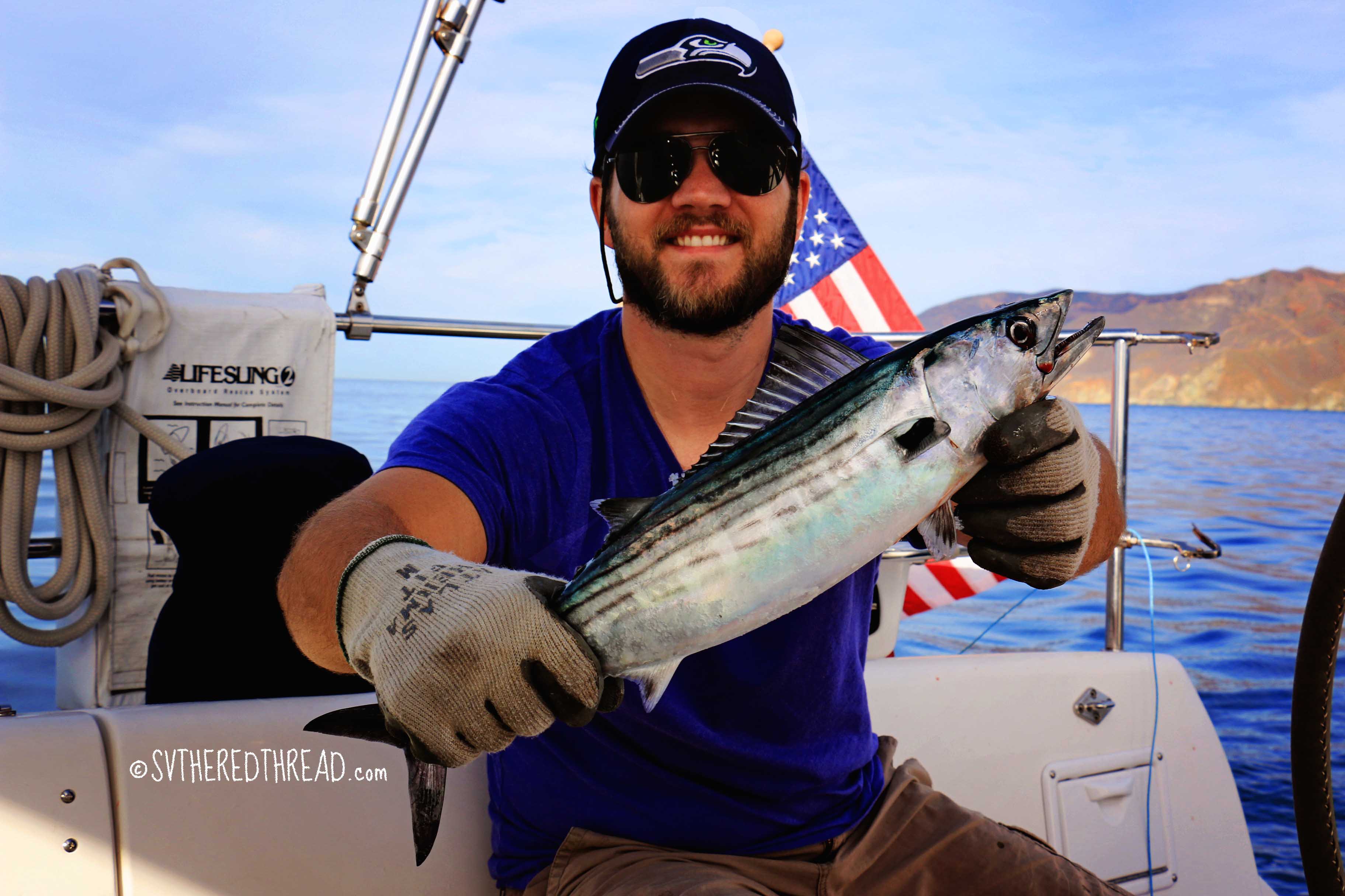 The next morning, we set our sights on Avalon. We departed soon after daybreak, eager to catch the little bit of wind that was forecast for the day. We hoisted the sails and got two hooks in the water as soon as we left the harbor. Within less than 10 minutes of dropping the lines, we were pulling them BOTH back aboard! Neil glanced back at the very moment a fish hit the lure on our starboard side! We pulled the handline aboard amidst cheers for our second catch of the voyage! Almost immediately, we pulled in catch number three! Having been raised in a farm-to-table family, I still believe that there are few things that can make you feel like master of the universe in the way that capturing your own dinner can. We are subsistence fishermen only, so our fishing ended that day almost as quickly as it had begun. Our fish identification skills are sorely lacking, so we were thankful to get cellular service long enough to the google photos of local fish. We’d snagged a duo of 14-inch pacific bonito*! The pair would make for a tasty dinner, maybe even two!