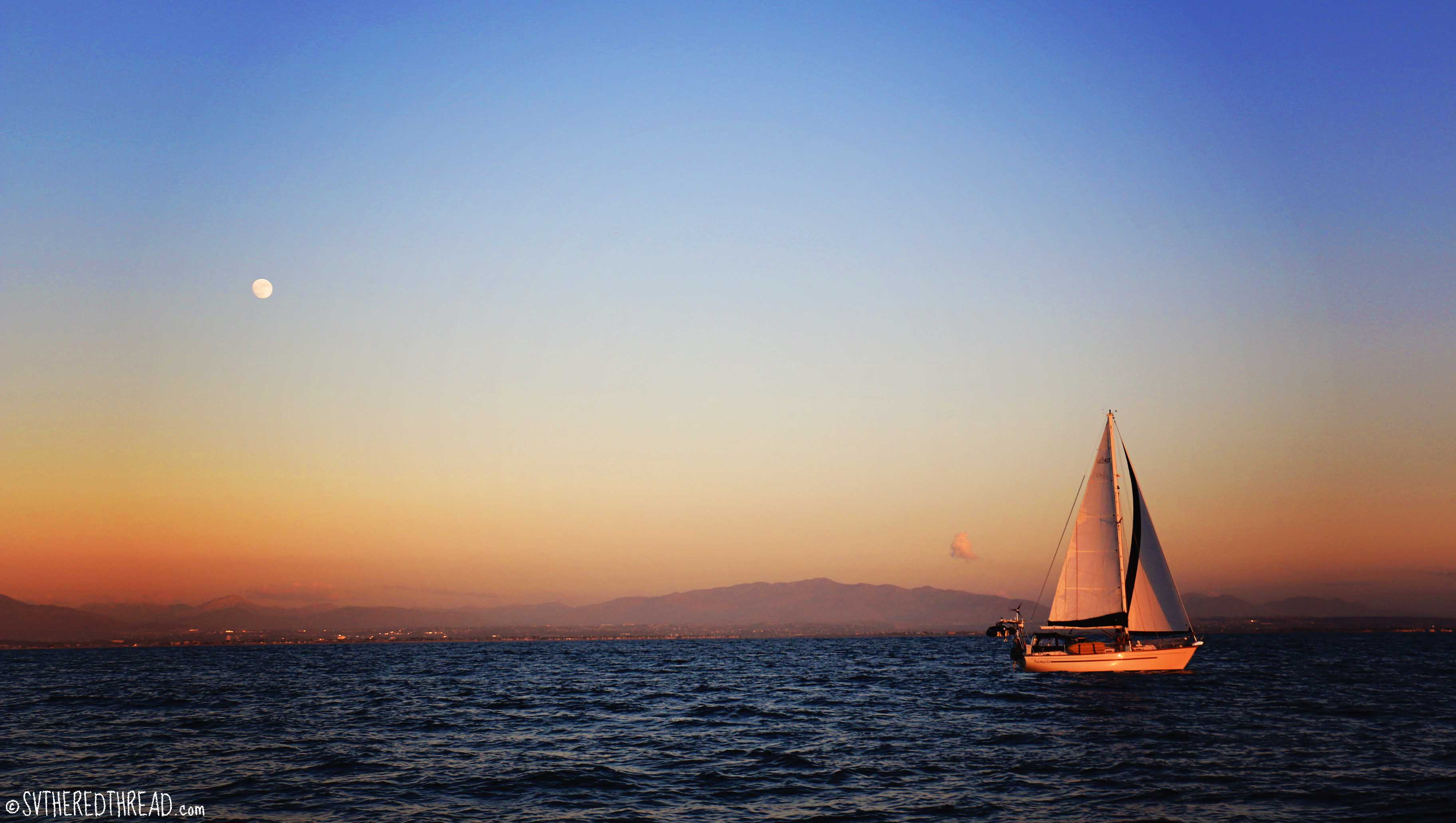 We are in the center of the fleet as the sun melts into the horizon. The sails of our good friends on s/v Namaste look like wings under a pink sky with an early-rising moon. Ahead of us are s/v Sea Rover II and s/v Kialoa, two Canadian couples whom we met just a few days ago. Behind us, s/v Astraea with whom we connected initially via our blog, carrying her family of three. The youngest crew member among us, two-year-old Sully, likely napping his way across the border. Our fleet of five look beautiful sailing together into the sunset, all eager to begin our adventures in Mexico.