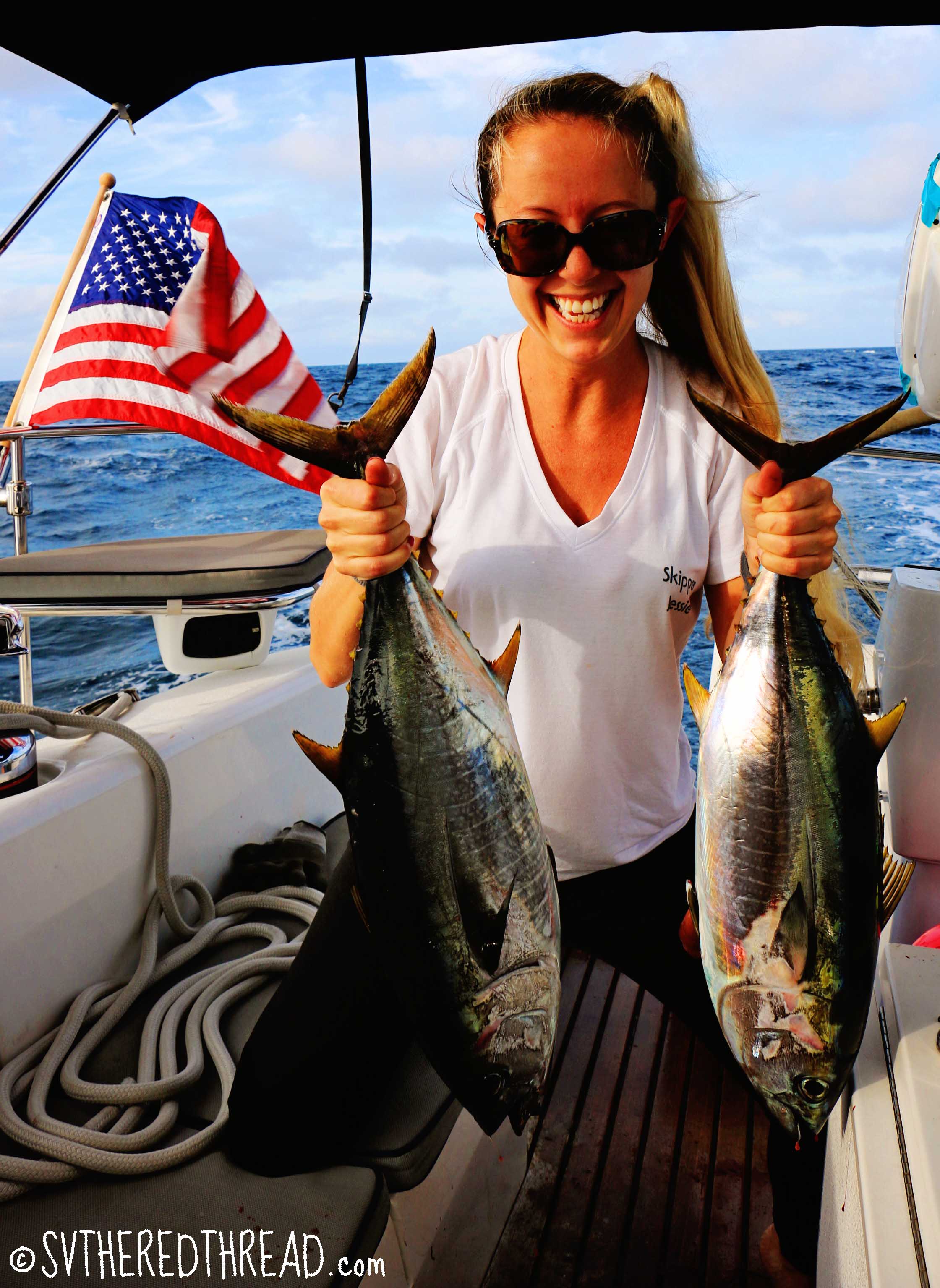On day three of our passage, our wishes for fishes were granted. Like the striped bonito we had caught off the coast of Santa Catalina Island in California (turns out they were striped bonito, not Pacific bonito, as we’d initially described), we hooked two big eye tuna simultaneously! They were 25 and 26 inches long, and we elected to keep both, knowing we’d be meeting our fellow Umbrellas Dumpers in Bahia de Tortugas in less than 36 hours. We could share King Neptune’s bounty with friends!#Passage_Neil w-dos tuna