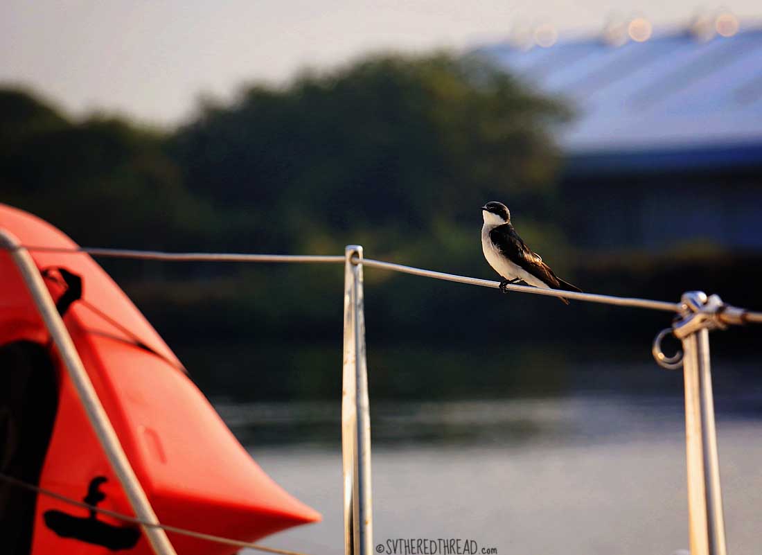 The sound of several species of birds fills the morning air. Along the shore, I can see chickens, frigates, pelicans, and vultures. At least two dozen “tweeties”, as we’ve taken to calling the darling birds that sometimes flit around the boat, are here. The teacup-sized birds seem to be playing a twitterpated game of chase.