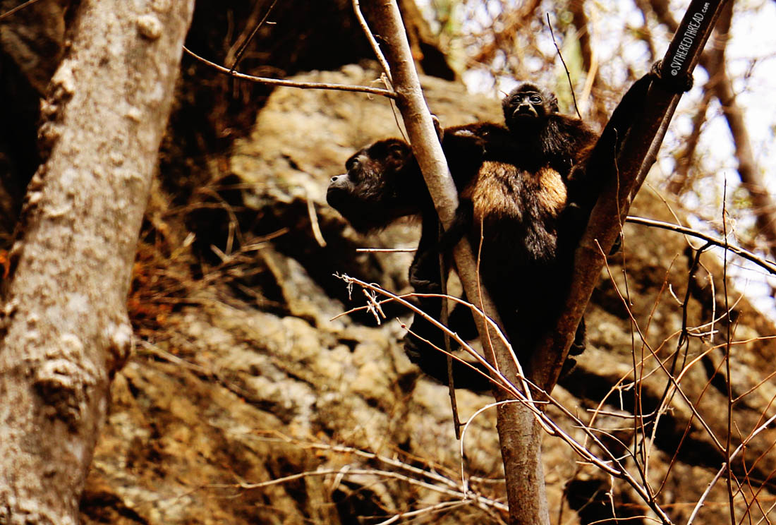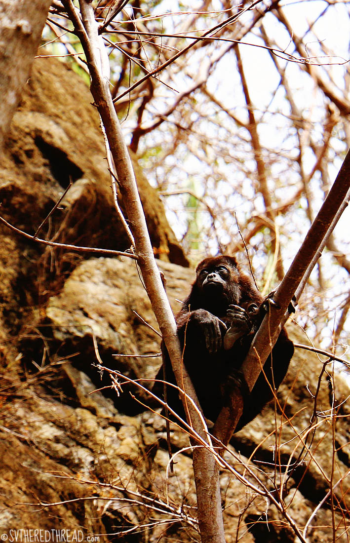 Four islands guard the northern arc of Bahia Huevos. Two are hardly more than large rock outcroppings; two are small, steep mounds, barely one-third of a mile across. From a distance, they appear quite lifeless. As we sculled from the inner shoals of the bay and neared them, however, we heard the throaty yowls of howler monkeys. Neil, already a decent distance ahead of me, accelerated his pace. I had been snapping photos of pelicans who lazed on the volcanic rocks along the ocean break. I quickly stashed our camera back into my dry bag and paddled frantically to catch up.#Bahia Huevos_Lazy pelicansWe’d gone monkey scouting several times but had only seen the creatures off in the distance or with the aid of binoculars. Yet here we were, sitting inches above the ocean, staring at a tree full of howlers! We dashed our little orange boats onto the sand and crept closer. Howler monkeys are brown-black in color, with dark, soulful eyes. Their only pale flesh identifies unmistakably the bits that confirm their sex (e.g., ahem, their “huevos”, if you will).#Bahia Huevos_Howler monkey2We had happened upon a family: a mama with her babe clinging to her belly, a protective papa who was riled up by our presence and rather vocal, and two smaller members of the tribe whom we guessed might be adolescents.#Bahia Huevos_Howler mama + baby1 #Bahia Huevos_Howler monkey1The monkeys maintained their territory in the trees above, while another world buzzed at our feet.