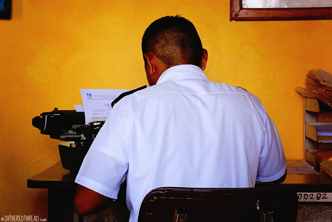 The officer thumbed through our documents and requested our passports, hardly acknowledging the entourage, save a tolerant eye roll. He retrieved a crisp sheet of paper from a filing cabinet, walked across the room, and set the page in a typewriter. As he did so, we snuck big smiles and little waves at the boys.