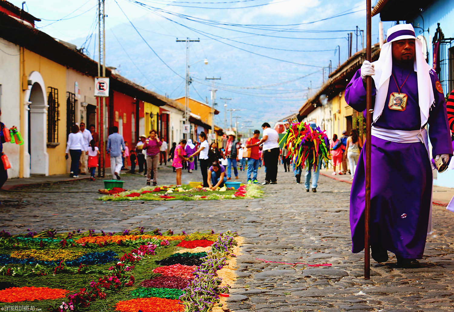 During Semana Santa, worshippers relive the final days of Jesus Christ’s life, from his arrival into Jerusalem to his agonizing death and, ultimately, to his resurrection. Thousands of believers take to the streets robed in purple, a symbol of their penitence, their reverence remaining steadfast amid the crowds of Guatemalans and international tourists congesting the streets.