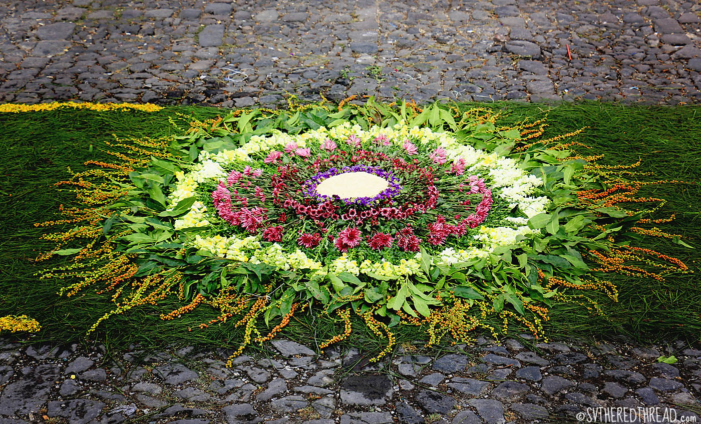 In the days leading up to Good Friday, devotees invest hours or even days constructing ornate carpets, called alfombras, in the cobblestone streets. The alfombras represent a stunning fusion of indigenous tradition and Christian worship. Offerings are designed using colorful sand, fruit, nuts and seeds, flowers, and dyed wood shavings. Many of the designs stem from Mayan traditions and the natural materials are not so different from those that might be used in indigenous ceremonies.
