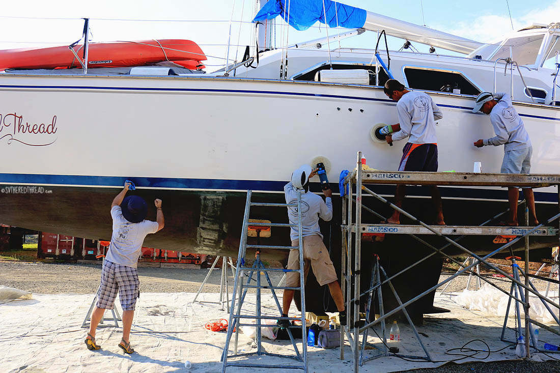 - Polish + wax the hull: Most of the in-the-yard tasks were primarily functional. Waxing and polishing is important for protecting the gelcoat, but its aesthetic effects are far more overt. This was the task that helped give Red Thread her sexy back. We hired Quepos Yacht Care to help with the process and worked alongside them to improve our technique and expedite the process. We completed the task in full in a single day, and by the time we were done, we could see palm trees reflecting in her hull!
