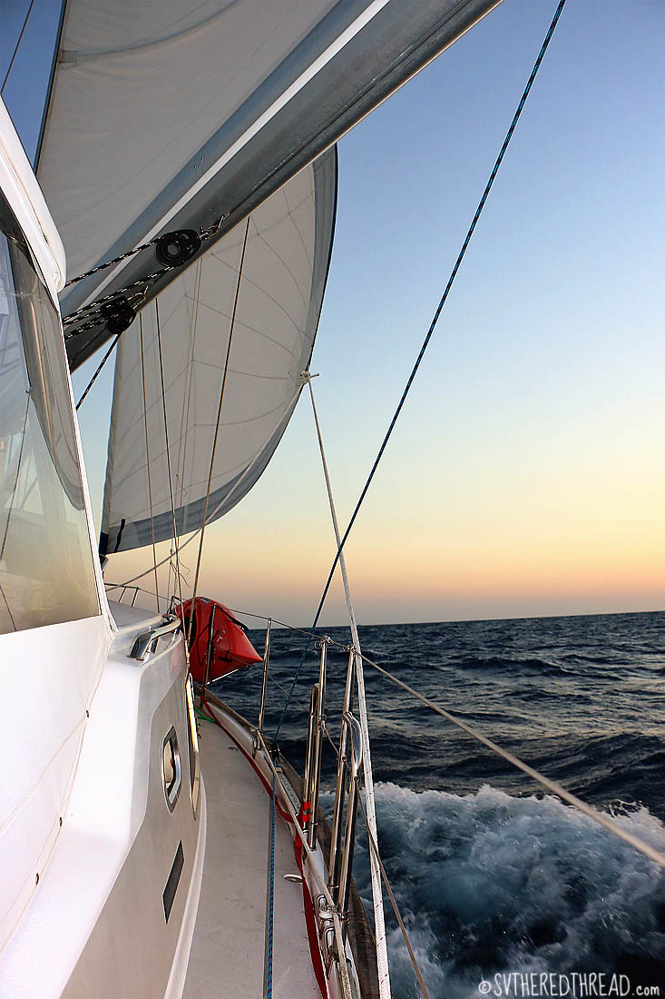 In our experience, day 2 is the most difficult of any passage. The off-we-go-adrenaline has subsided, and sleep schedules have yet to be well-established. Our crew of three was fatigued, but we did our best to settle into a routine that would maximize rest and conserve energy.