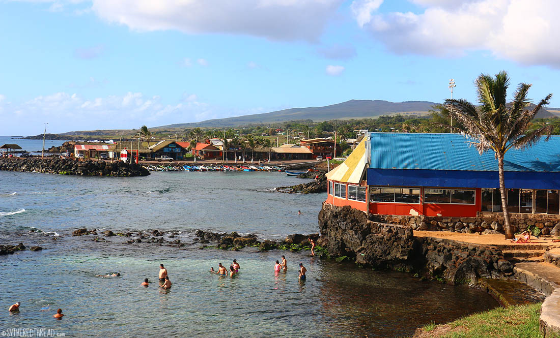 We buried our 45-pound delta anchor in the sandy seabed 90 feet below our hull—the deepest anchorage we may ever experience—and dumped 250 feet of 3/8” chain along with it. Two hours later, the Chilean Armada sped from the island and retrieved El Capitan in a panga. The swell had tempered, but it was still too massive for them to simply tie up to the Red Thread. The entourage bobbed around and completed clearance procedures. We celebrated that night by opening a bottle of wine from friend, Randall, one of our dockmates back at Elliott Bay Marina, that we’d saved for  a special occasion since leaving Seattle.rapa-nui_passage-to-hanga-roa rapa-nui_officials-in-hanga-roarapa-nui_vino-from-randallThe only way ashore is to race your dinghy between sets of breaking waves to the dog-leg turn that opens to the safety of a small fishing harbor. It is a hair-raising experience to say the least, but we subjected ourselves to it day-after-day as a price to pay to explore the island and learn more about its history. The exit proved particularly dicey most days. One couple had their dinghy flipped by the breaking surf! We experienced the sensation of flight on more than one occasion, literally launching 200 pounds of dinghy and outboard motor, along with our anxious bodies, from the crest of waves as we raced their breaks!rapa-nui_hanga-roaHistory and mystery