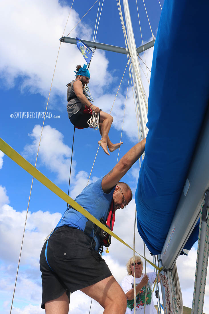 rapa-nui_ahu-nau-nau2rapa-nui_watermaker-repairrapa-nui_up-the-mast-on-prince-diamondAfter four days of exploring and tackling projects aboard Red Thread (and s/v Prince Diamond) in Rapa Nui’s northernmost anchorage, swell conditions improved, and our small cruising fleet sailed from Anakena to Hanga Roa to officially clear into the country.