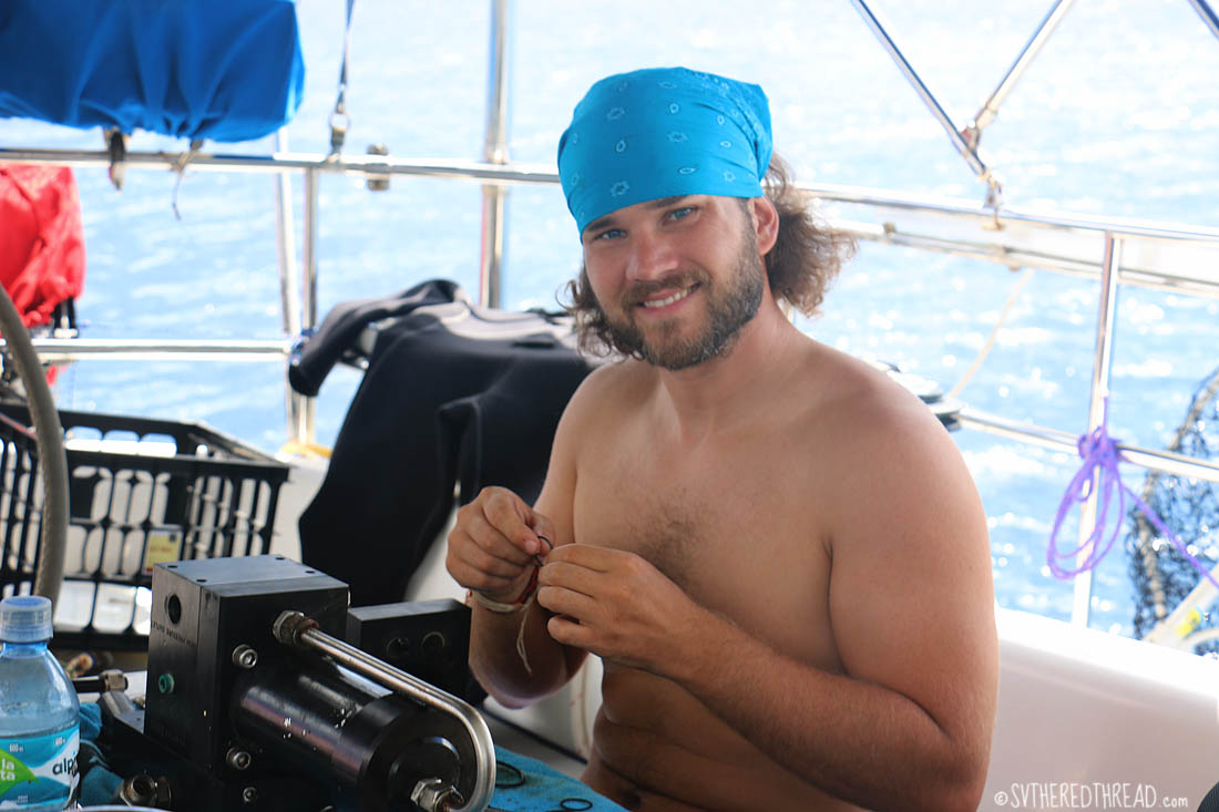 Since long before we cut our dock lines, Neil dreamed of getting a Polynesia tattoo during our voyage. The idea of a single tattoo morphed into the concept of a progressive piece of art that would evolve as we sailed from one island chain to the next. Easter Island, being our first and most-remote stop in the Polynesian triangle, was the right place for him to begin. Ironically enough, the tattooist Soane Tauataina, was from Wallis Island several thousand miles away on the northwestern fringe of Polynesia. The style that spoke to him most was derived from Marquesan tradition, and he worked with Soane to select meaningful symbols that would wrap around his forearm.