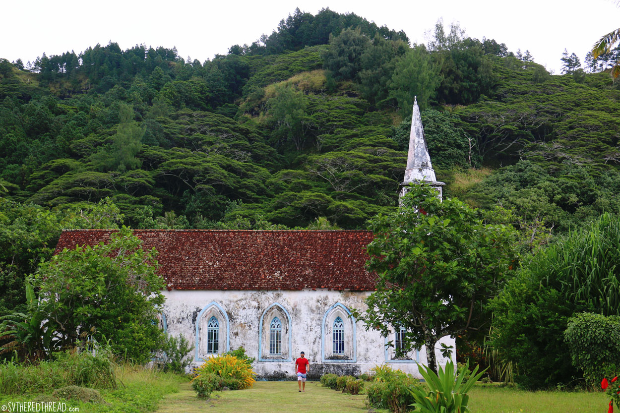 Herve and Valerie live a short walk down the beach, on the other side of the church of St. Gabriel, another of Honore Laval’s creations. The couple are her caretakers, mowing the grass, dusting the pews, and keeping fresh flowers upon an alter that is rarely used for services nowadays. The church is a beautiful neogothic structure, with a steep crimson roof, baby blue accents around lancet windows, and mildewing shading that speaks to the structure’s 148-year existence in the tropics.taravai-gambiers_st-gabriels-church