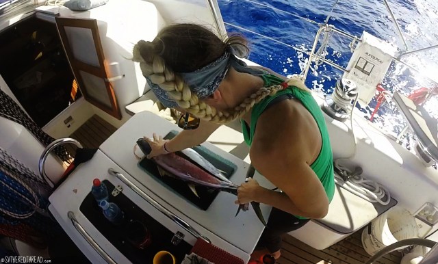 Jessie’s musings: My belly was a tangle of knots those first few hours. It’s funny how just a few weeks in a safe harbor can dull a sailor’s grit and stir anxiety. Every new passage is an opportunity to renew my fervor for the sea and to baptize my soul in a queasiness that—at moments—cripples me. I remember the gratitude I felt when we hauled in a massive skipjack tuna. Skipjack don’t always make our eyes sparkle. They’re the less delicious variety of the tuna family, after all. But she was our grandest thus far. Interestingly, she was more flavorful than other skipjacks we’d tasted. She rivaled any yellowfin we’d caught! Our initial grumbling that she was not a yellowfin was replaced by gratitude that she was exactly what she was…an animal gifted to us from King Neptune himself. An animal that would nourish our bodies for days.