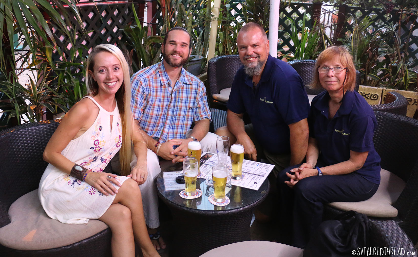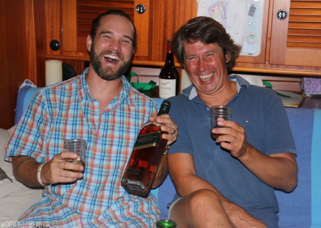 The day after we made landfall, we wandered down the dock toward town, off to see about tracking down our batteries and other parts for the boat. Sweat beaded on our skin and the glare of the sun blinding. We hardly noticed the brilliant smile of an old friend rushing toward us, her colorful skirt sashaying in the sunshine, until the moment she embraced us. Jude!! Our dear friend from s/v Sarita hugged us tightly. The saying that cruisers don’t say goodbye, they say, “See you later” rang true again… we’d last seen our dear Saritas at the anchorage in Chamela in January 2015. Seventeen months and thousands of ocean miles later, our paths converged again at last! It’s too damn hot to give a hug in the tropics if you don’t really mean it. We meant it wholeheartedly. The Saritas are favorites among our cruising family, and this reunion was long overdue. The sacrificial lamb to commemorate our reunion would be a bottle of scotch…