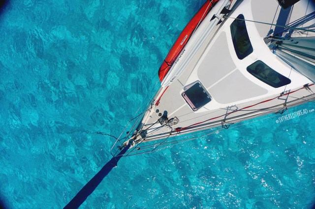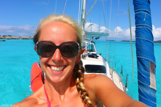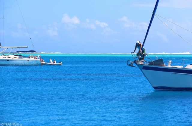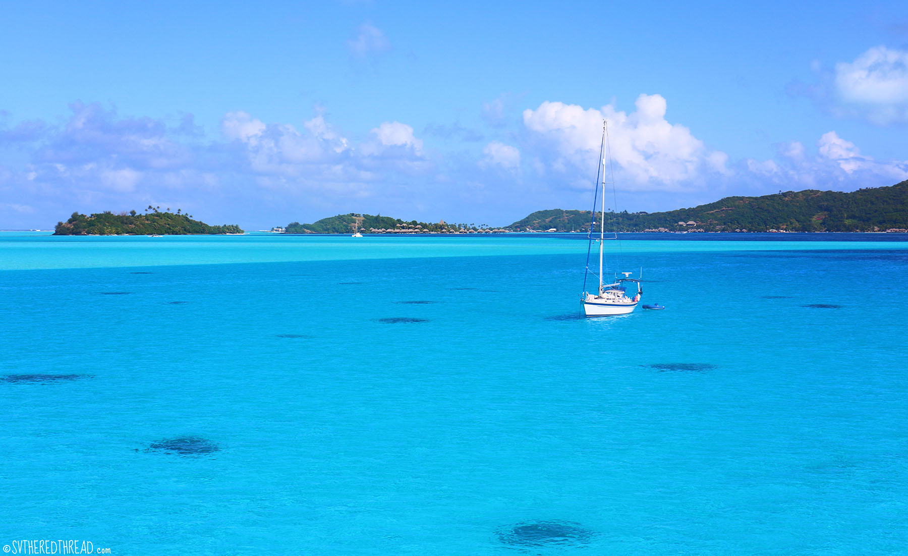 The next few days were a blur of morning snorkels, afternoon naps, and evenings of games and over-imbibing with the Saritas. Neil dove beneath the boat, pressed his feet into the sand beneath Red Thread and pressed the palms of his hands against her keel. Less than 6 feet of water separated our 15-ton boat from the seafloor. In Bora Bora you can anchor in these shallow conditions because its unique location in (quite nearly) the dead center of the southern Pacific Ocean means there’s almost no tidal change (typically less than 12 inches). I went up the bosun’s chair to snap a few photos, images of a tropical dreamscape that will be seared into my mind for the rest of my days.