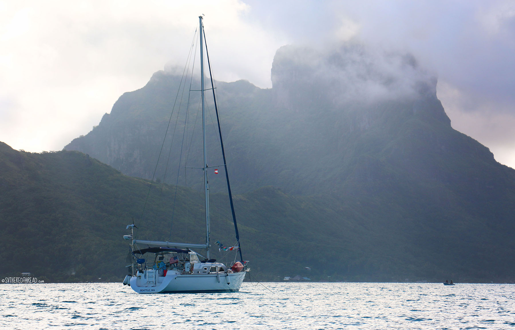 We raced across the stretch of water that separates the Taha’a and Raiatea, tickled to fly full sails in 12 knots of breeze beneath cotton candy clouds and excited to return to Bora Bora, where we planned to go ashore and celebrate my birthday. Thirty-three was my “Red Thread” birthday—my age matched her hull number—which somehow gave the birthday an extra dose of special.