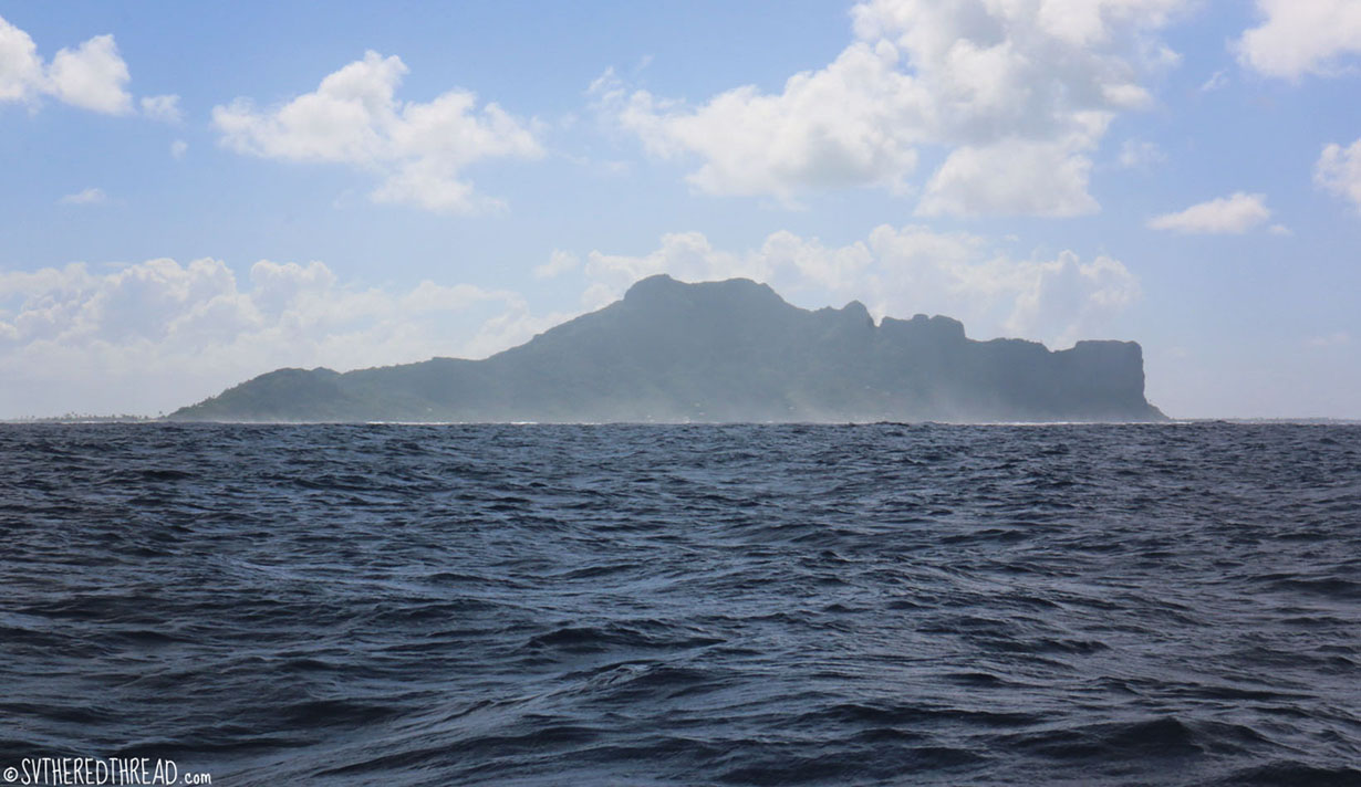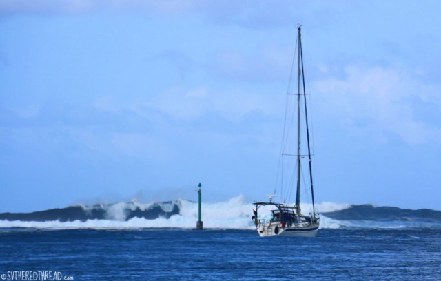 Nine-foot breaking waves clawed at the reef and mammoth swell surged on either side of the disconcertingly narrow pass through the reef—the only way in or out of the lagoon. My fists were clenched tightly around the helm, and I was trying my best to steer Red Thread along the line we marked on our chartplotter when we arrived at Maupiti. Our rashguards, still damp from a final morning swim, whipped on the lifelines, a distraction in my peripheral vision. The current was accelerating, and a knot of anxiety was tangling my guts. This was our most raucous harbor exit to date by a factor of about 10, and I was happy to step aside for the Captain to take over for this one.