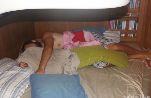 Neil passed out horizontally across the bed after coming off watch during the night of churning seas and squalls.