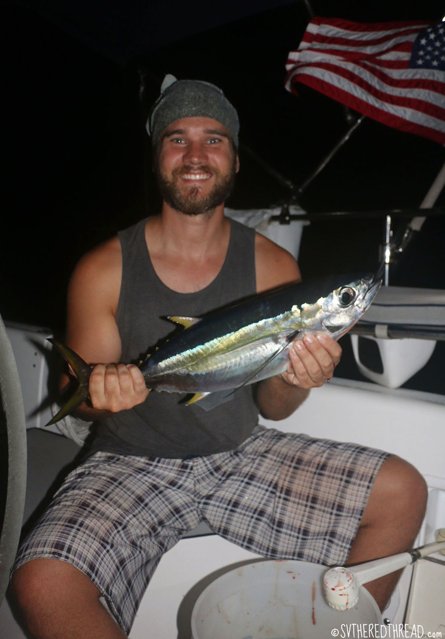 As Neil was pulling in our handlines on our final night at sea—just before we were to heave-to and decelerate our pace to a drift—our handline went taut most unexpectedly. Delighted, we pulled in a small but exquisite 20.5-inch yellowfin tuna!