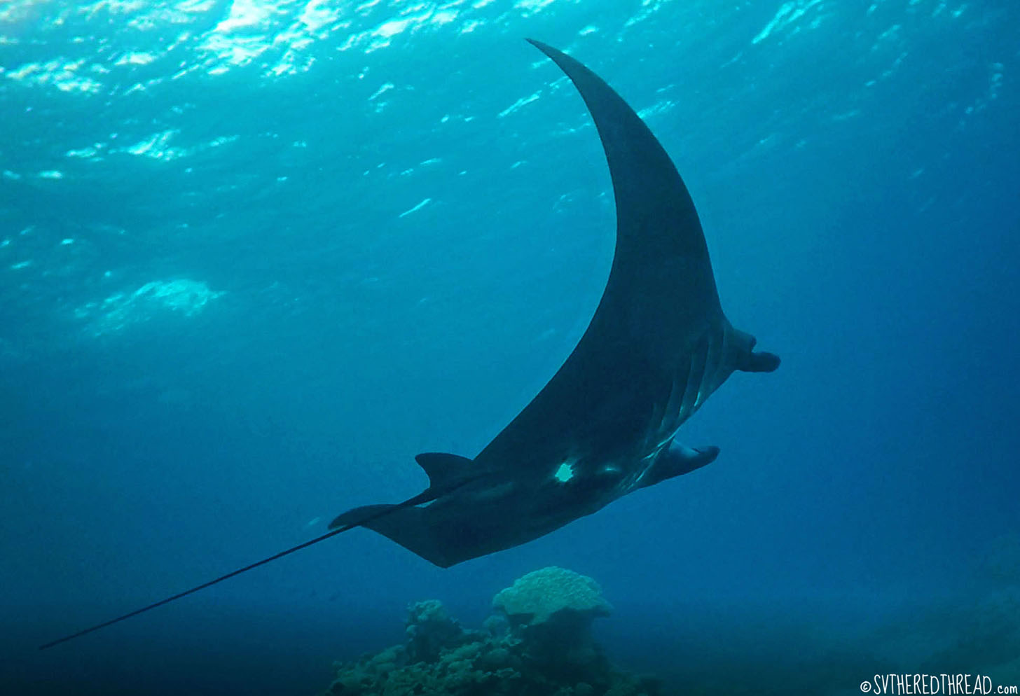 Another morning, we dinghied to an area where manta rays sometimes congregate. The water was so clear that it was easy to spot dark telltale wings gliding below us. We flung ourselves overboard, letting our eagerness to be in the company of the majestic animal supersede our trepidation about grey sharks (which we spotted soon after we got in the water…). Unlike the mantas we saw in Bora Bora and Maupiti, we managed to capture an image of this one’s underbelly, which is essential for identification, like a fingerprint. We submitted it to the Manta Trust and were thrilled to learn that we had sighted a young female who had never before been documented! We were granted the honor of naming her. Given that manta rays are viewed as spirit guardians in Polynesian culture, we called her “Denise Dawn Ann” in tribute to three beloved women in our life who have been confronted with very difficult challenges in recent years.