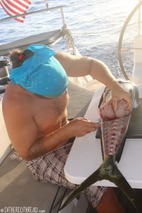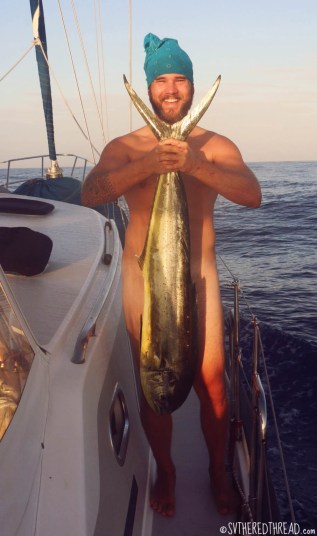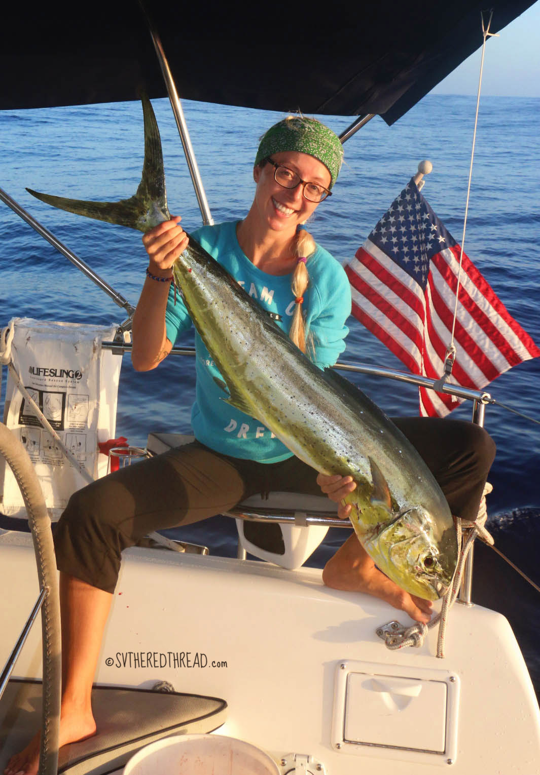 I want to get this photo right. I’ve been waiting for this moment, for this pelagic fish. Since sometime before we embarked on our voyage, I have wanted to recreate the image that covers The Cruisers Handbook of Fishing, the authority on fishing while voyaging, even still after nearly 20 years since publication.
