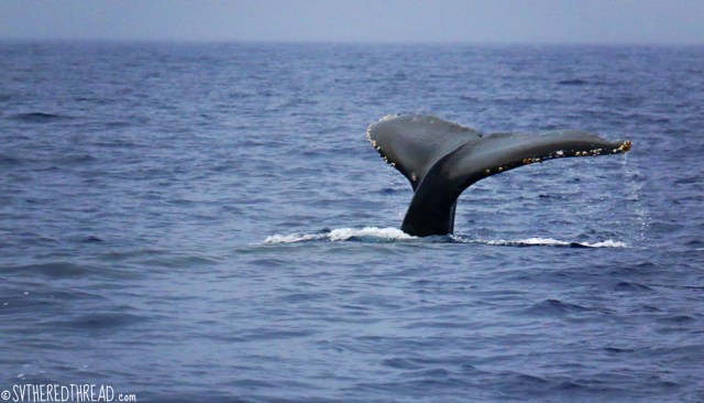 As we angled Red Thread’s bow toward the open ocean, Fiafia instructed us to watch for spouts (also called “blows”) and “footprints” or glassy sections of water that might indicate movement just below the surface. Less than 10 minutes passed before we had our first sighting of the day! We learned that the angle at which a humpback dives will give some indication of whether they will surface again soon or whether they intend to remain submerged for a longer period. If you see their fluke (i.e., tail), you can expect that they are diving deep and likely won’t surface for 20 minutes or longer. If the angle is softer, they may be on the move (“a traveller”) or intending to surface again shortly.
