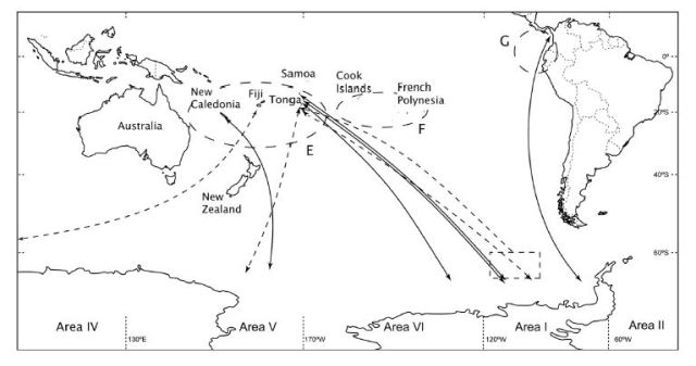 This figure shows “migratory connections of humpback whales between breeding grounds of Oceania and the eastern Pacific, and feeding Areas of Antarctica” (p. 655). It was published in a 2018 paper in Polar Biology by Steele and colleagues. The full-text article is freely accessible by clicking on the image.