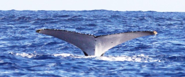 As we angled Red Thread’s bow toward the open ocean, Fiafia instructed us to watch for spouts (also called “blows”) and “footprints” or glassy sections of water that might indicate movement just below the surface. Less than 10 minutes passed before we had our first sighting of the day! We learned that the angle at which a humpback dives will give some indication of whether they will surface again soon or whether they intend to remain submerged for a longer period. If you see their fluke (i.e., tail), you can expect that they are diving deep and likely won’t surface for 20 minutes or longer. If the angle is softer, they may be on the move (“a traveller”) or intending to surface again shortly.