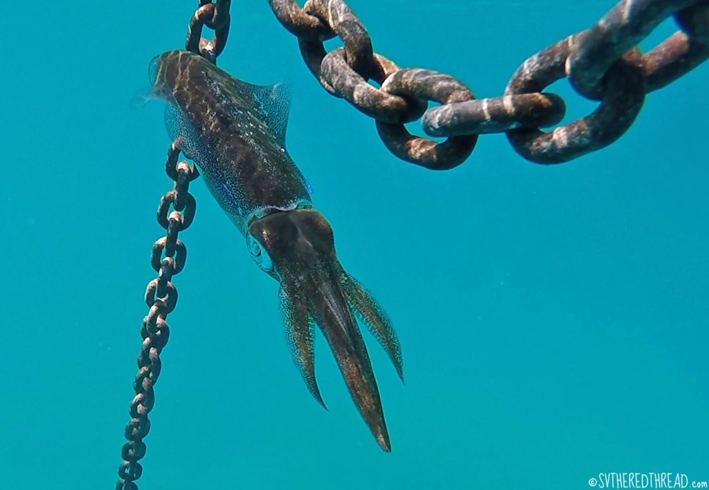 The never-ending flush of ocean water ensures the anchorage is eternally pristine. The water was so clear that we could see a creature swimming around our anchor chain and were delighted to dip in and discover a rather curious foot-long squid!