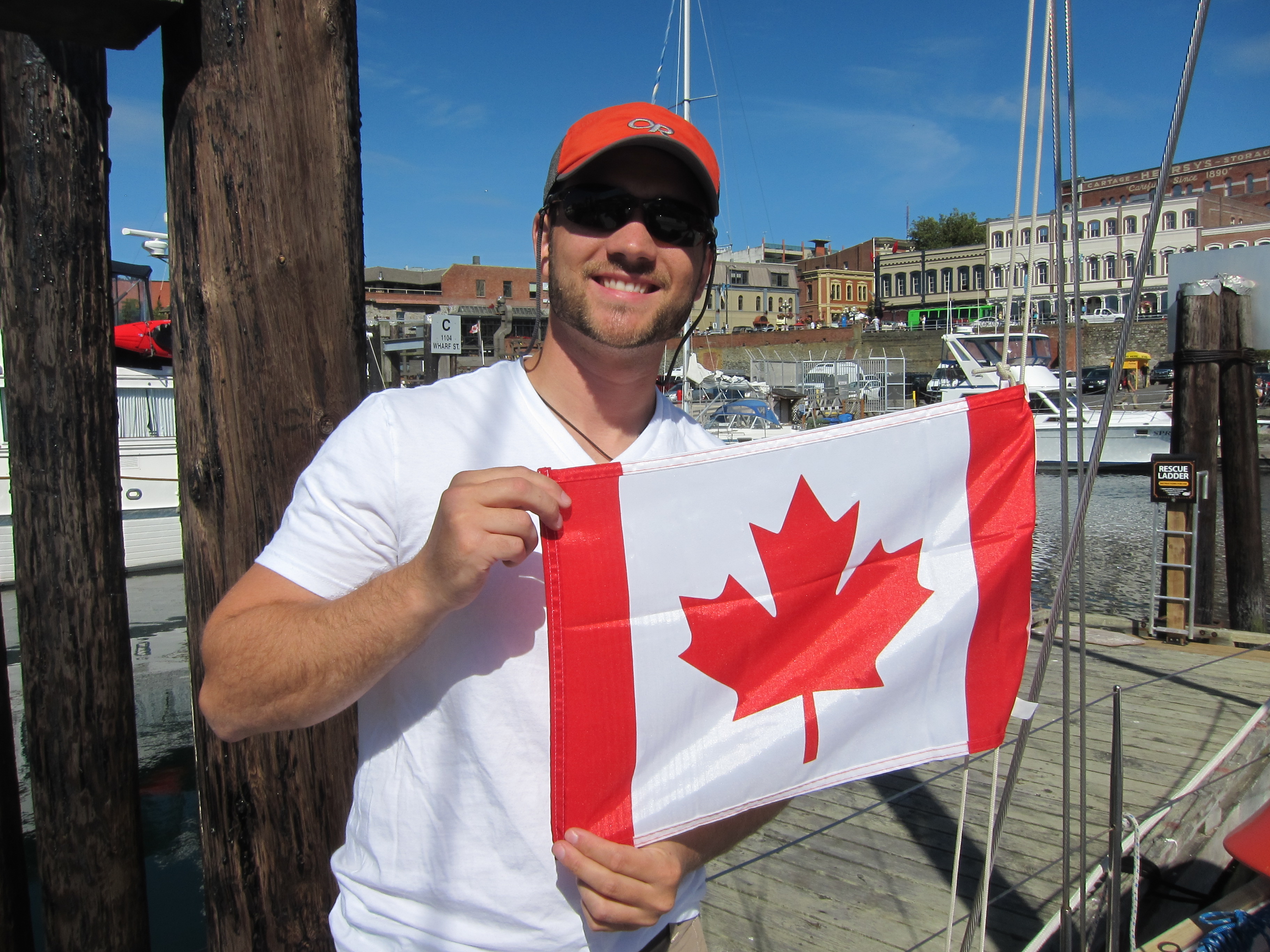 We arrived in beautiful Victoria, after sailing nearly the entire way from Anacortes! A spectacular day, complete with perfect wind. We cleared customs and docked for the night at the Wharf Street Floats. We were elated to raise our first courtesy flag and to fulfill a promise we’d made to each other before we ever purchased The Red Thread. We said that someday we’d sail into Victoria – and then we did!